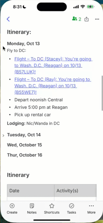 Tables look great on desktop but often require horizontal scrolling on mobile. When designing notes for travel, like itineraries, use collapsible headers instead.