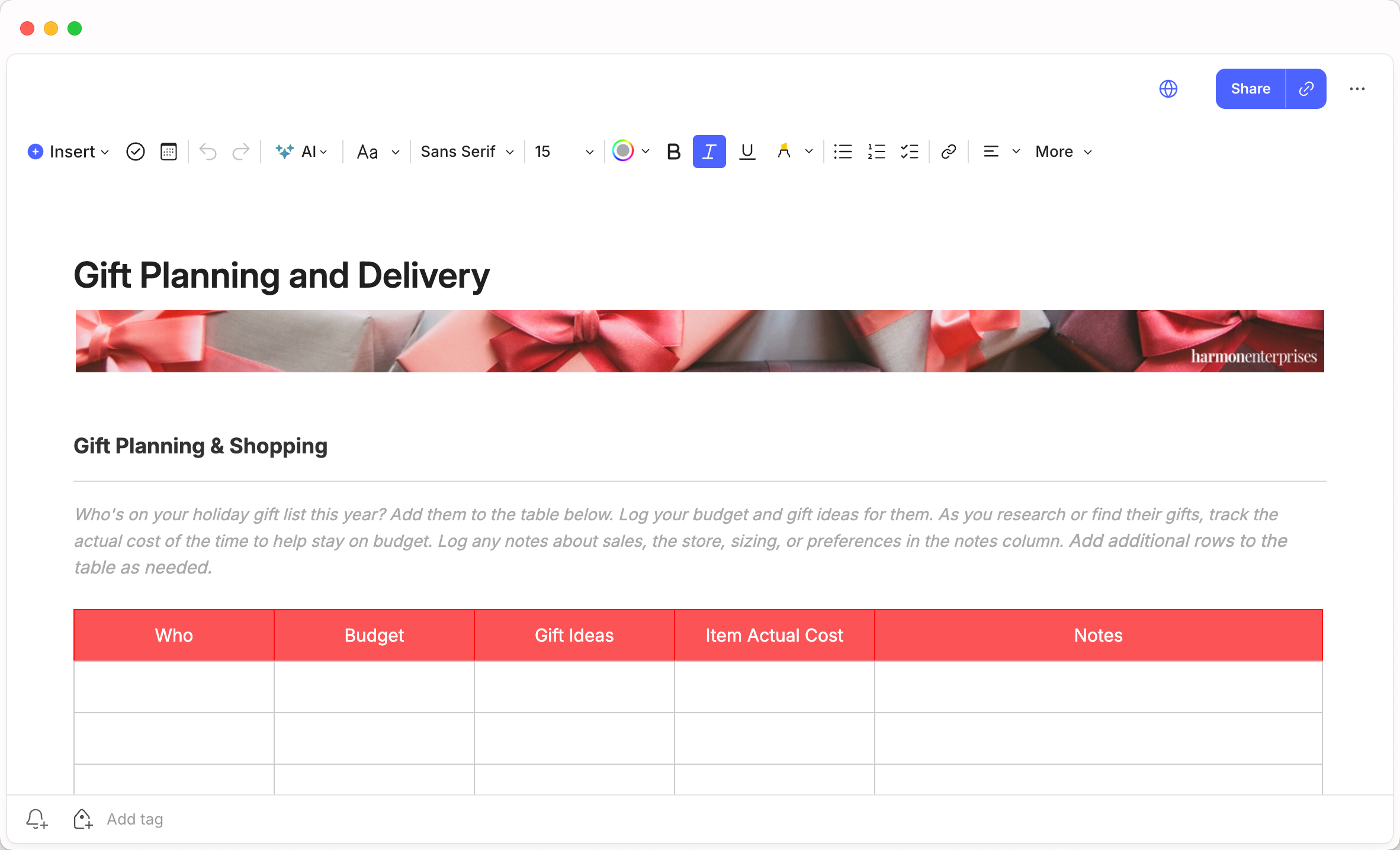 2. Gift purchasing tracking — Use tables to track what's been ordered, received, and wrapped. Create columns for the recipient, gift idea, purchase status, tracking number, arrival date, and wrapping status. This eliminates the "wait, did I already buy that?" confusion.