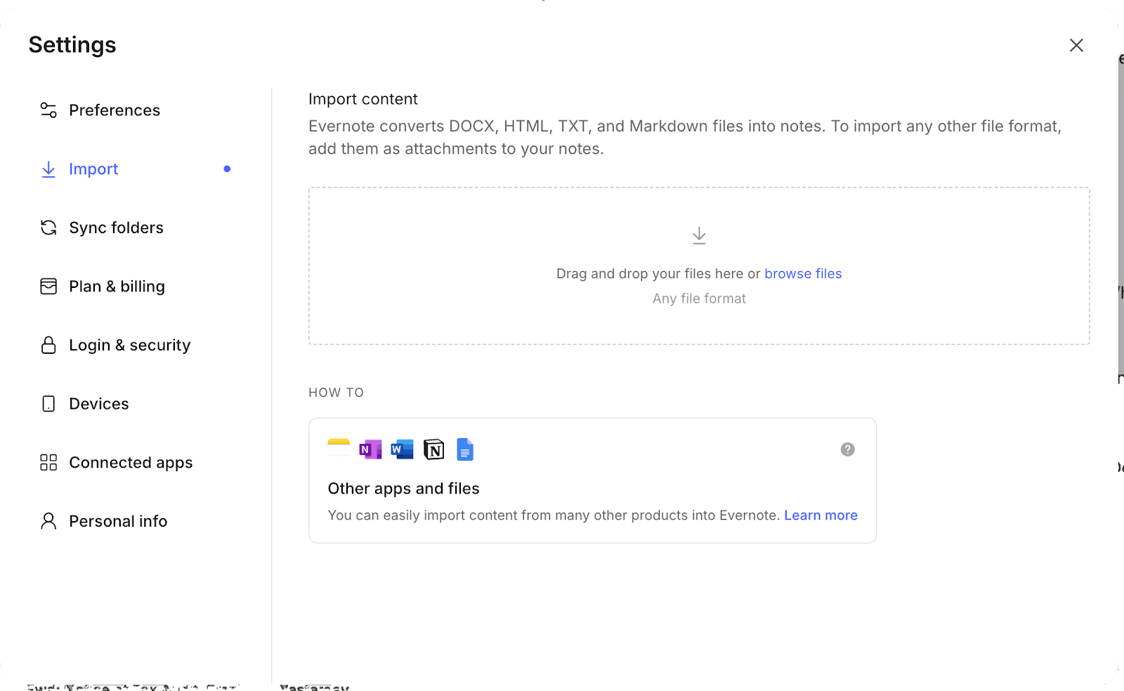 Evernote also has an Import section in Settings where you can import files. But here's the key difference: certain file types get converted into editable notes.