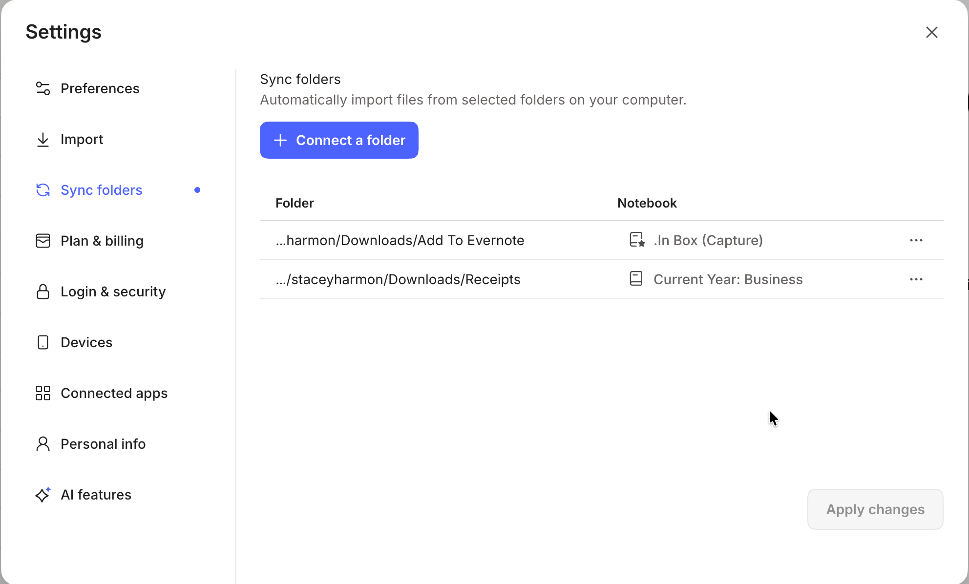Click “Connect folder” and select the folder you want Evernote to monitor
